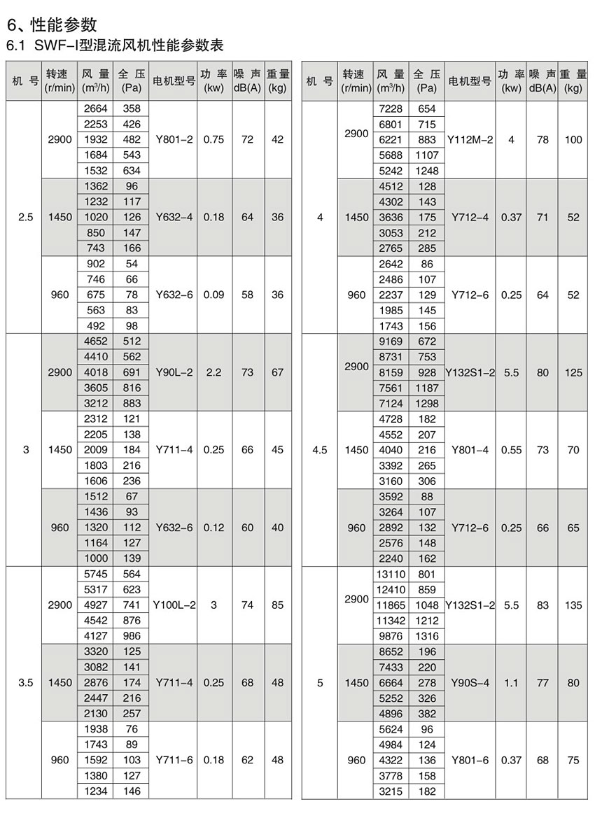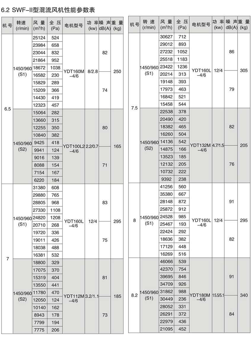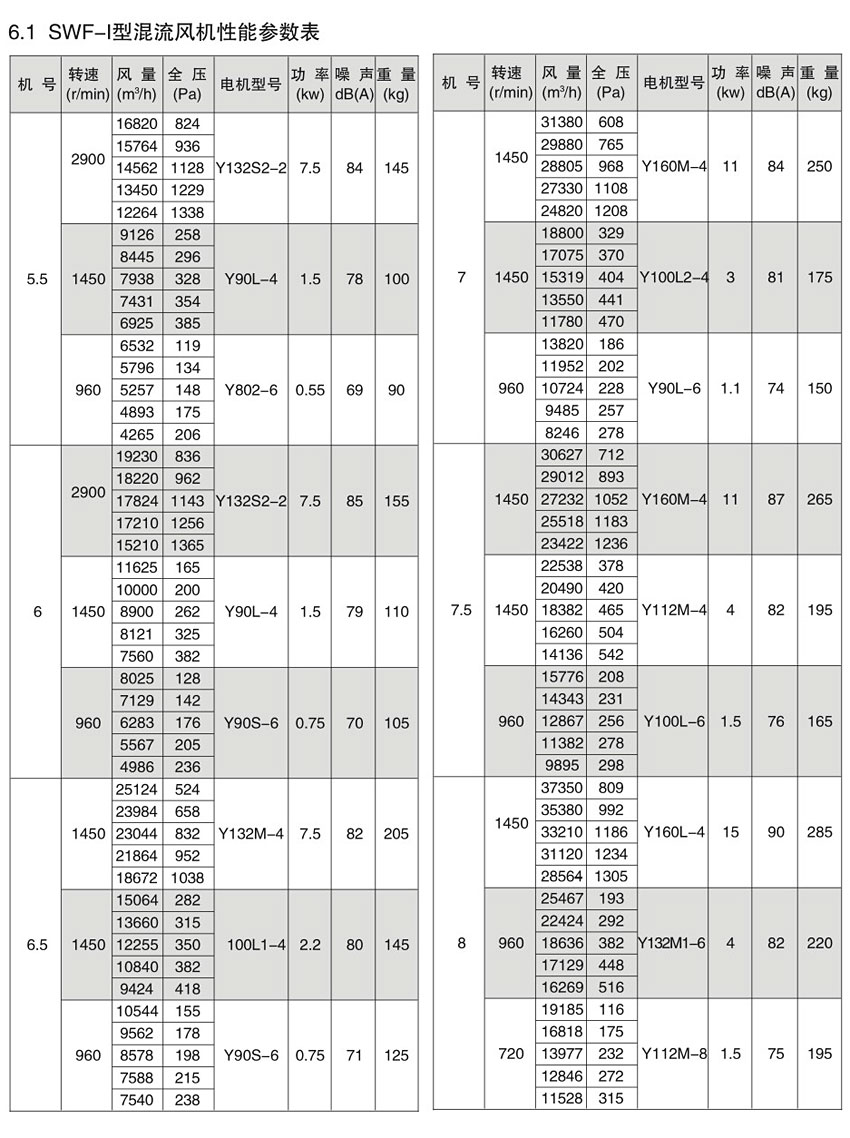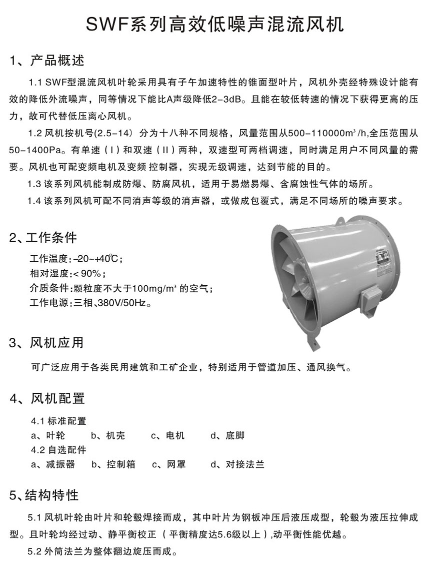 SWF系列不锈钢混流风机具有同机号风机量较离心风机大,风压较轴流风机高,可以轴向安装等特点。本系列风机应用场合广泛,如各类高级民用建筑、工矿企业等。